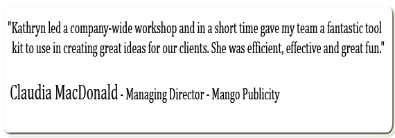 “Kathryn led a company-wide workshop on brainstorming and in a short time gave my team a fantastic tool kit to use in creating great ideas for our clients. She was efficient, effective and great fun.”