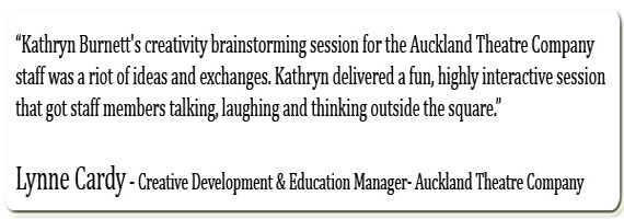 “Kathryn Burnett's creativity brainstorming session for the Auckland Theatre Company staff was a riot of ideas and exchanges. By leading us through a series of deceptively simple but increasingly challenging exercises, Kathryn delivered a fun, highly interactive session that got staff members talking, laughing and thinking outside the square. Kathryn’s manner was warm, encouraging and professional. She kept us on task and didn’t let the energy dip for a second. We would certainly consider booking further sessions with her in the future.”