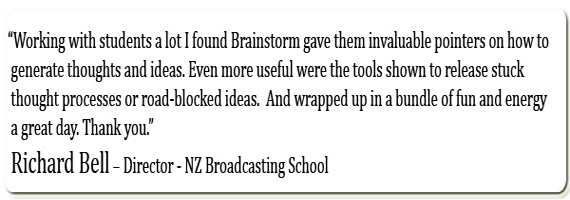 “Working with students a lot I found Brainstorm to give them some invaluable pointers on how to generate thoughts and ideas. Even more useful were the tools shown to release stuck thought processes or road-blocked ideas, tools which will be essential to them in their careers, all wrapped up in a bundle of fun and energy - a great day. Thank you.”